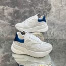 Step into contemporary luxury with these pristine Alexander McQueen Sprint Runner sneakers, showcasing a clean white design accented with vibrant blue details. Crafted from a blend of premium white leather or high-quality synthetic overlays and breathable mesh panels, these low-top sneakers feature a striking blue heel tab and subtle blue accents around the lacing. The defining characteristic is the iconic oversized, chunky white rubber sole, which extends beyond the heel, providing both a distinctive aesthetic and enhanced cushioning. White laces complete the modern design. These sneakers perfectly embody Alexander McQueen’s blend of athletic inspiration with high-fashion artistry, making them a versatile and coveted statement piece for any discerning wardrobe.