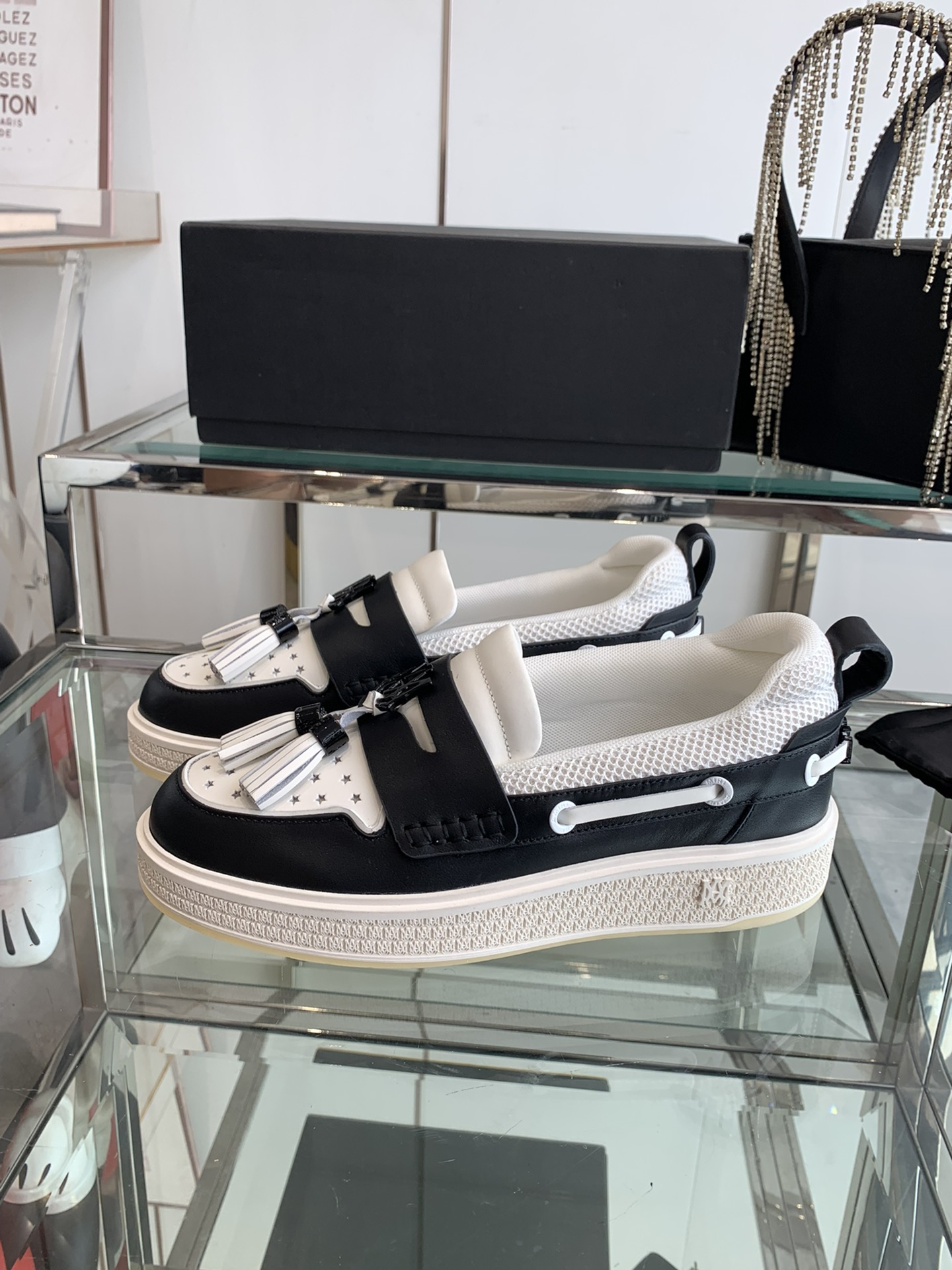 - Fuse casual cool with sophisticated flair in these unique Amiri MA Tassel Hybrid Loafers. These innovative slip-on shoes seamlessly blend the relaxed appeal of a boat shoe or sneaker with the elegant silhouette of a loafer. Crafted from a refined combination of smooth black leather and breathable white mesh/perforated textile side panels, they offer striking contrast. The design is highlighted by classic white leather tassels and a sleek black leather strap across the vamp, adorned with subtle hardware. A crisp white leather toe cap with delicate star perforations adds intricate detail, while boat shoe-inspired lacing in white encircles the collar. Sitting atop a chunky, off-white rubber sole with distinctive texture and “AMIRI” branding, these loafers deliver both a modern aesthetic and luxurious comfort.